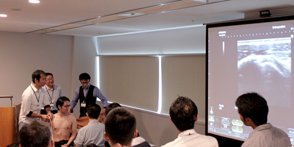 座長には大会長である矢島勇先生について頂き、参加頂く先生方から事前にご提示いただいたエコー画像を元に、講師、参加者の方々で多くの意見を交換していただきました。また最後には、徳田仁志先生により肩関節の後方関節唇の観察方法を説明して頂きました。