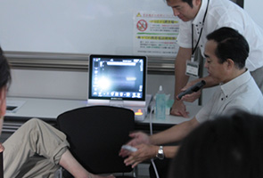 実際にどのような症例を超音波画像診断装置で見ることが出来き、X線に比べどれくらいの優位性があるのか、柔道整復師の業務範囲である骨折や軟部組織損傷などの症例を説明されました。もっとも多く聞かれる『骨折はわかるのか。』という質問に対しては、わかりやすく実際の骨折症例をレ線像とエコー画像と対比させて、それぞれの優位性と難点を解説していただきました。 また、軟部組織損傷に関しては、「実際にこんな患者が来たらどう判断、対処するか?」ということについて、脛骨骨折やアキレスけん断裂、肘内障等の画像を見ながら判断、対処法を講義して頂きました。