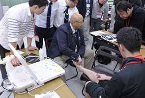 実際に超音波画像診断装置を使い、プローブの当て方などの基礎技術について、説明を受けながら熱心に聞き入っていました。